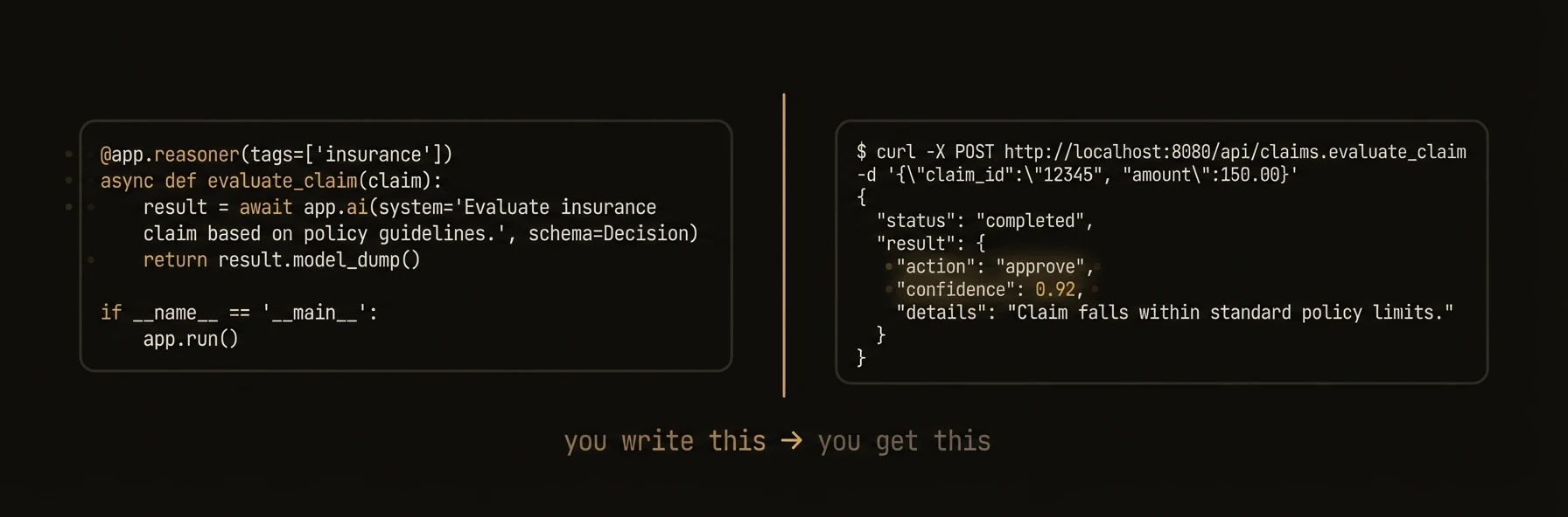 app.run()// Same idea in TS: Agent + reasoner + app.ai with a schema.